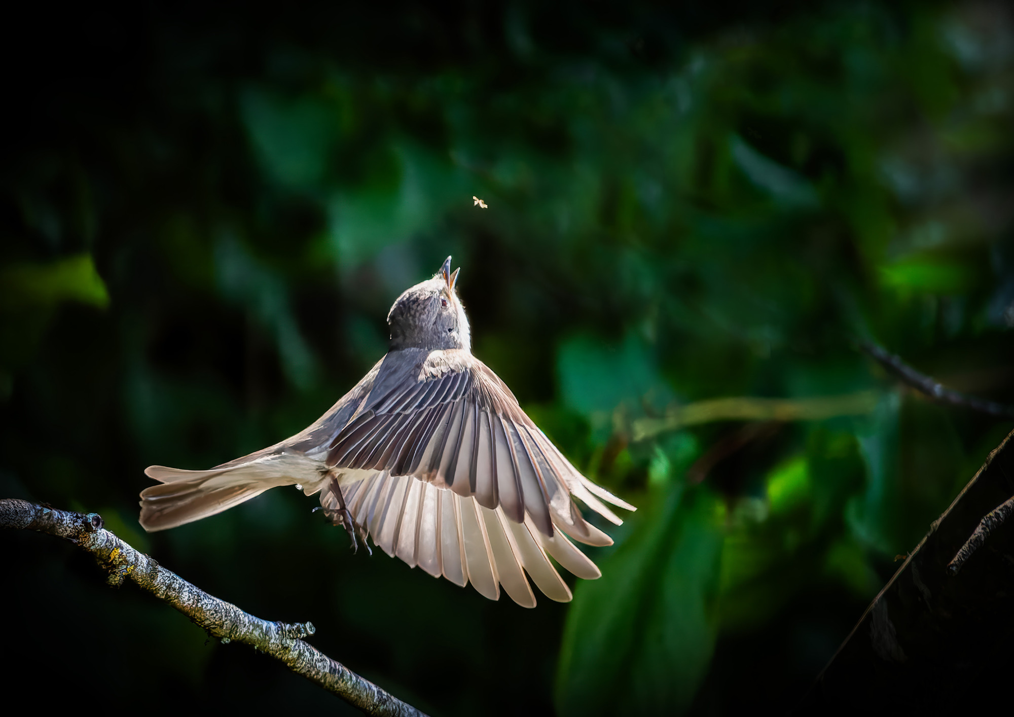 „Schnapp“ – Ein Grauschnäpper auf der Jagd nach Insekten. Diese zierlichen, extrem flinken Vögel sind jedes Jahr bei uns zu Gast. Sie sitzen scheinbar entspannt auf ihrem Ansitz, um im entscheidenden Moment blitzschnell zuzuschlagen.